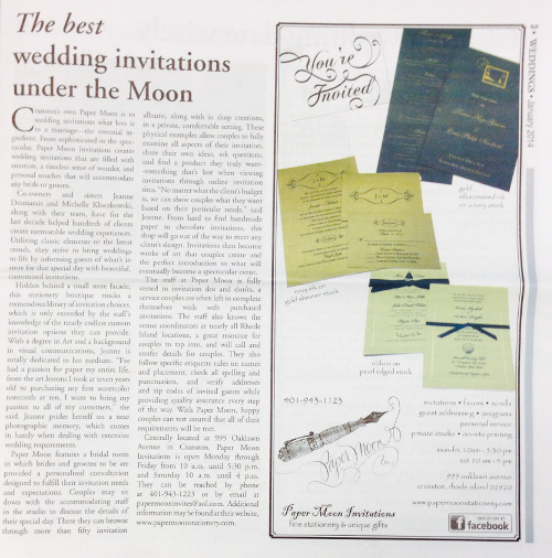 Paper Moon Invitations has received various awards: Wedding Wire Couples' Choice Award 2023 & 2025, Best of Discover Rhode Island 2022, Best of Rhode Island 2021, Best of the Knot 2020, 2021, 2022, 2024, 2025 & Hall of Fame.